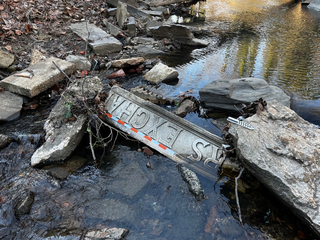 It isn’t every day that you find the illegally dumped remains of a historically significant building dumped in a creek, yet that is exactly the situation we found ourselves in standing before the 7 foot marble facade of the Old Baltimore Builders’ Exchange Building in the middle of the Maiden’s Choice Run. From being a center of Baltimore’s construction industry, to a center of the late Woman’s Suffrage Movement, the Old Baltimore Builders’ Exchange building was described for decades as one of Baltimore’s most prominent downtown buildings. Despite this, after the building’s demolition in 1966, the Old Baltimore Builders’ Exchange Building was nearly forgotten about until its rediscovery in the Maidens Choice.